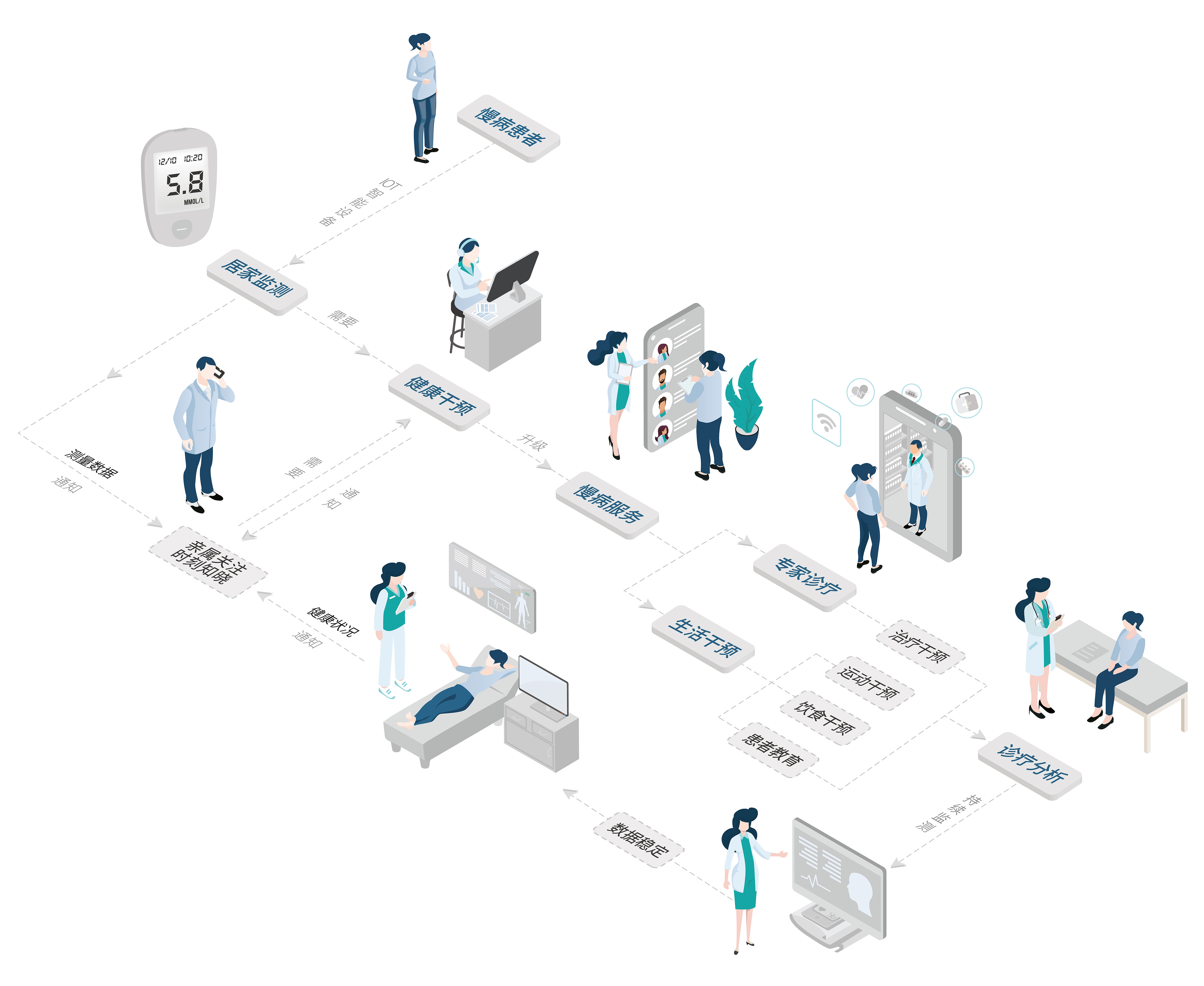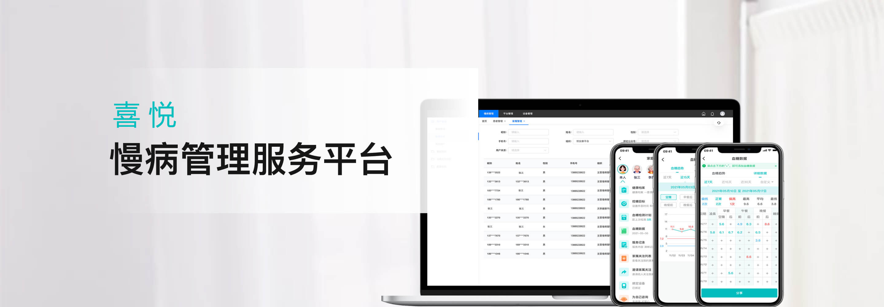 喜悦慢病管理整体解决方案,所提供的SaaS化系统是基于对设备数据的云端计算及智能分析,利用医疗大数据算法帮助专业健康管理服务团队及医疗服务团队。通过5G血糖仪、血压计、智能穿戴设备、蓝牙体脂秤等多种物联网硬件设备,实现对身体异常数据的及时反馈、跟踪、干预,实现上医治未病。使用户及患者能更早期的对疾病进行预防及管控,真正意义上提供有效及实时的健康管理服务,搭建基于患者家人+患者本人+健康服务机构+医疗服务机构的共管机制。
